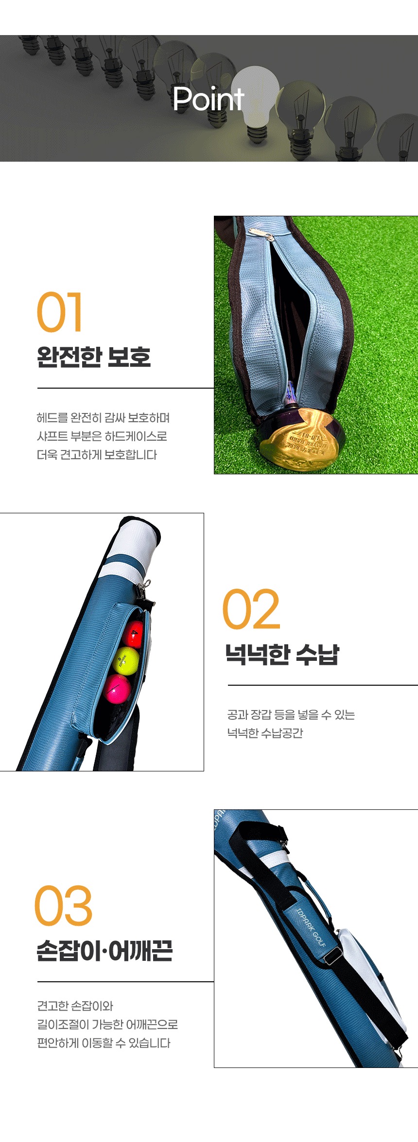 파크골프클럽 1개를 수납할 수 있는 견고한 파크골프 싱글 가방. 넉넉한 수납공간. 어깨끈과 손잡이.